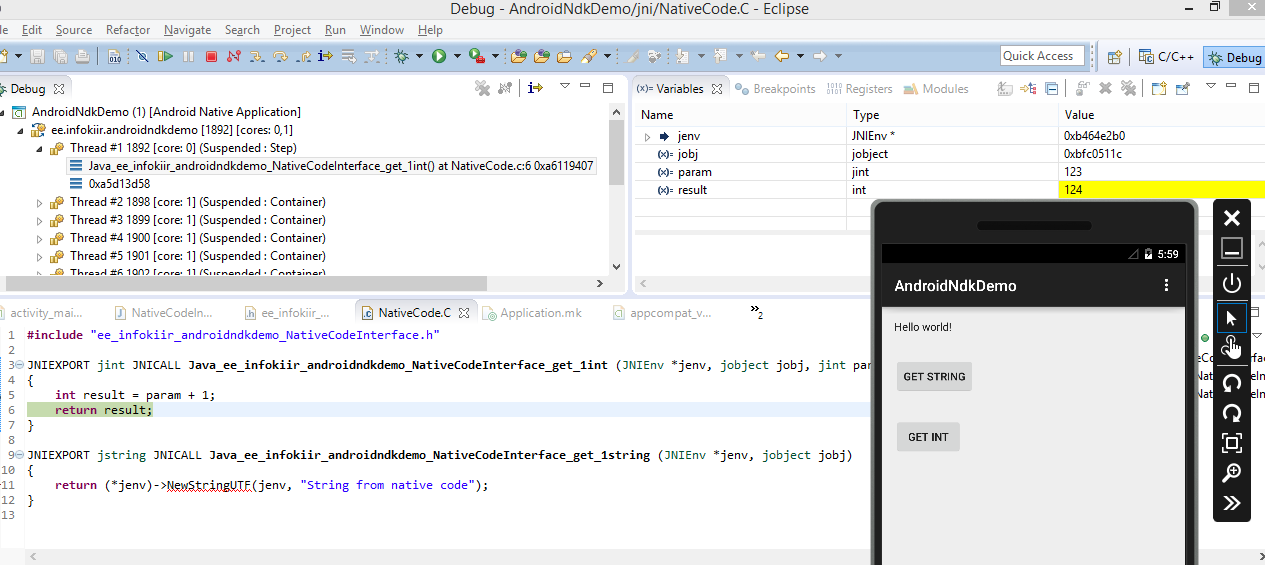 Kui nüüd valida Debug AS > Android Native Application, ning seejärel töötav Androidi emulaator, siis õnnestub meil samamoodi C-koodis peatus teha: