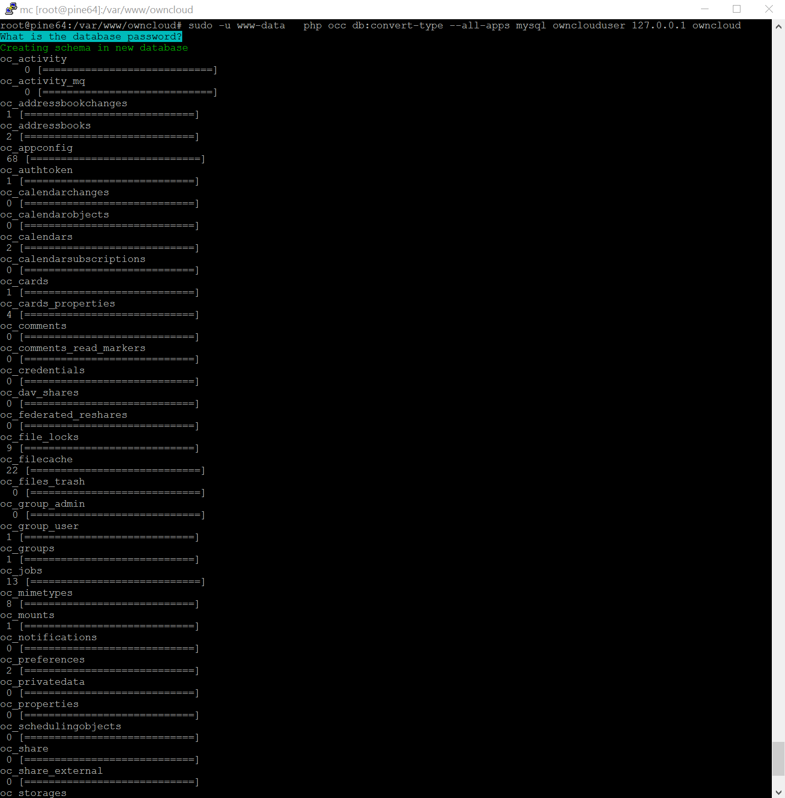 sudo -u www-data php occ db:convert-type --all-apps mysql ownclouduser 127.0.0.1 owncloud